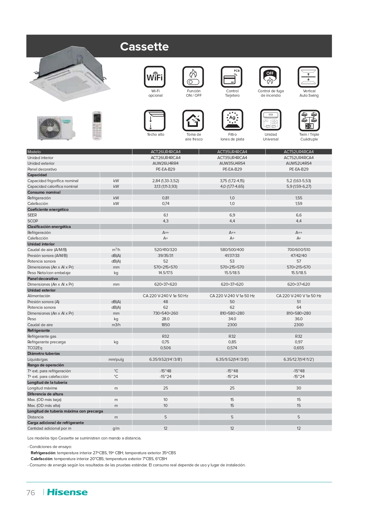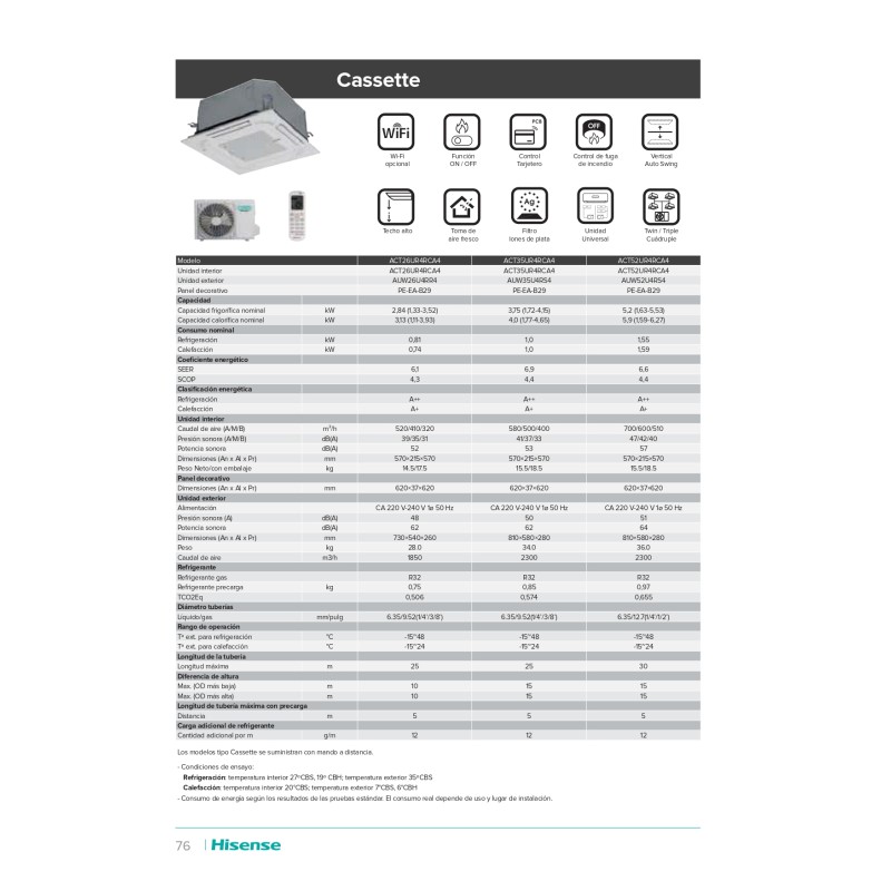 El aire acondicionado cassette Hisense ACT35UR4RCA4 - AUW35U4RS4 es una opción ideal para enfriar o calentar espacios de hasta 350m². Ofrece un rango de refrigeración desde 1480 hasta 3569 Frig/h o desde 1720 hasta 4150W y un rango de calor desde 1523 hasta 3630 Kcal/h o desde 1770 hasta 4650 W. Cuenta con un SEER de 6.9 y un SCOP de 4.4, además de una potencia sonora de 53 dB(A) para el interior y 62 dB(A) para el exterior.