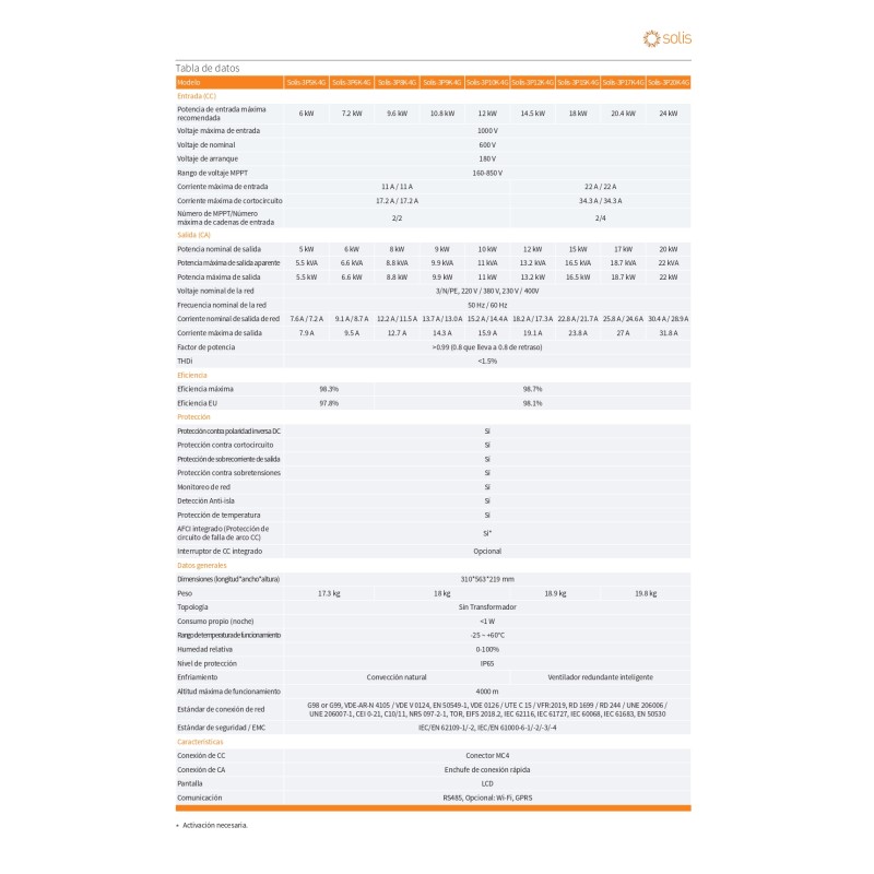 Desventajas Aunque el Inversor Solar Solis 3P6kW S5 ofrece una amplia gama de ventajas, hay algunas desventajas a considerar. Por ejemplo, este inversor sólo es compatible con módulos fotovoltaicos de tres fases. Aunque se pueden conectar dos módulos fotovoltaicos en paralelo, no se admiten más de dos módulos fotovoltaicos en paralelo. Además, el inversor solar no ofrece almacenamiento de energía, por lo que hay limitaciones con respecto al uso de energía solar durante la noche.