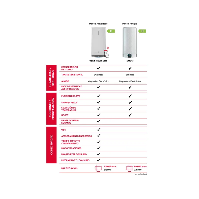 Uno de los rasgos más notables del Velis Tech Dry Wifi es su tecnología de doble depósito, que proporciona una mayor disponibilidad de agua caliente y una rapidez superior en el calentamiento del agua gracias a sus dobles resistencias envainadas anti-cal. Este diseño avanzado asegura una mayor durabilidad y eficiencia en el calentamiento del agua.