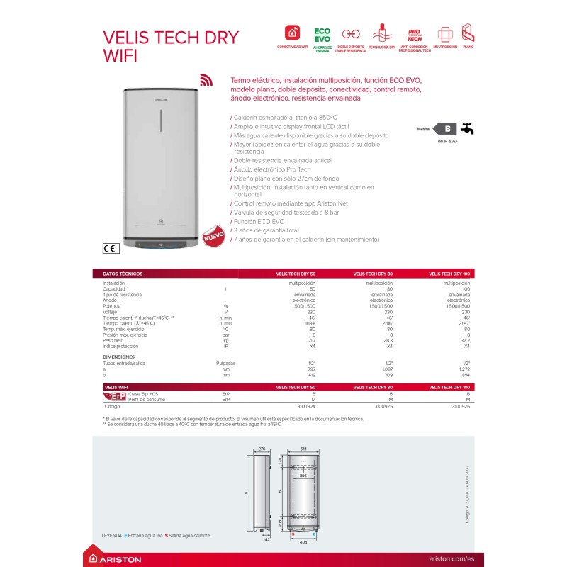 Termo eléctrico Velis Tech Dry Wifi 100 litros de Ariston