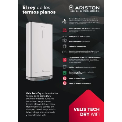 En resumen, el termo eléctrico Velis Tech Dry Wifi de Ariston representa una combinación ideal de diseño moderno, eficiencia energética, funcionalidad avanzada y control intuitivo, haciéndolo una elección excelente para cualquier hogar moderno que busca comodidad y eficiencia en su sistema de calentamiento de agua.